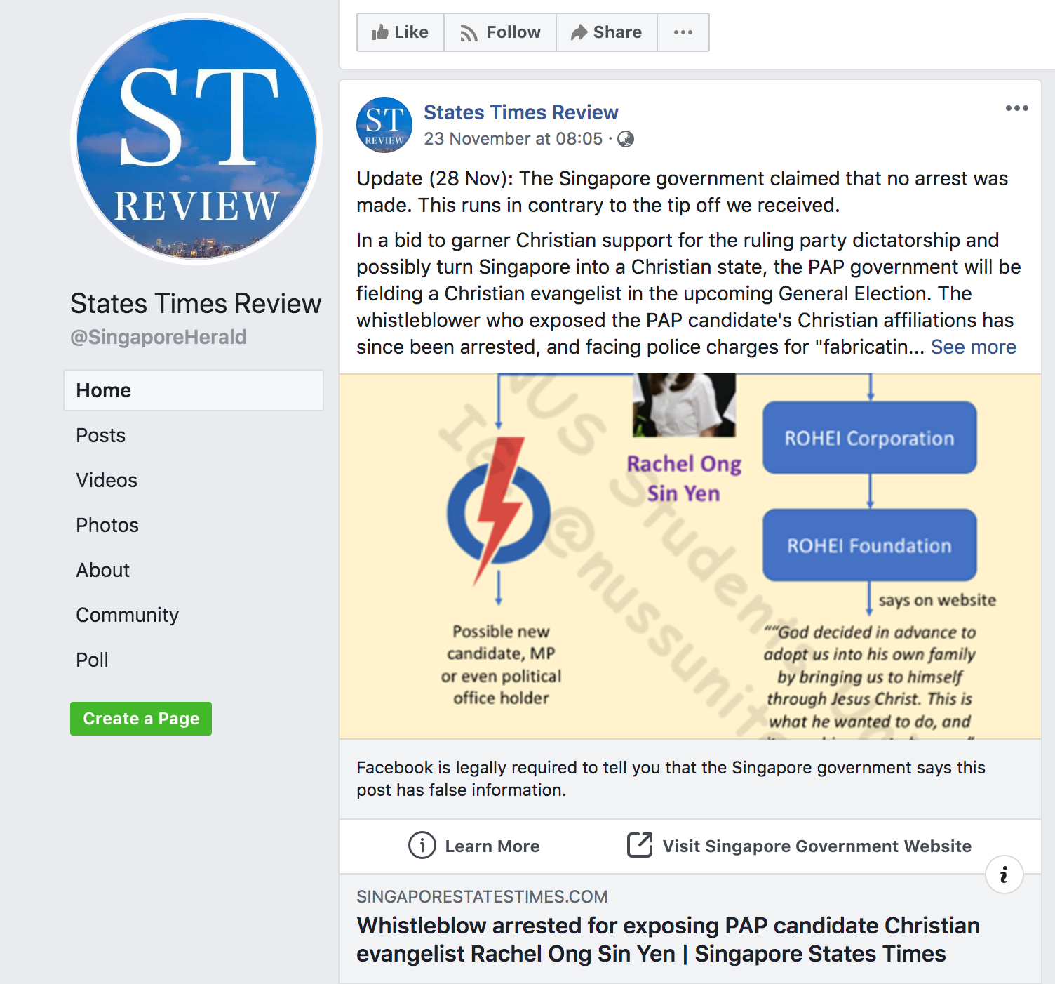 C’est la première fois que Singapour applique la nouvelle loi contre les Fake News (fausses informations) décrétée en octobre dernier, en dehors de ses frontières. Le journal State Times Review, tenu par Alex Tan, un Australien d’origine Singapourienne, a été sommé de retirer un article que le gouvernement qualifie de véhiculer de fausses informations. Le post révélait des informations sur l’arrestation d’un candidat prétendument accusé de fraude électorale. Le rédacteur en chef, Alex Tan a refusé de se plier à ces ordres en évoquant qu’en tant que citoyen australien, il n’accepterait pas les ordres provenant d’un gouvernement étranger. D’ailleurs, il a posté l’article sur diverses plateformes de partage comme Twitter, LinkedIn, Google Docs et Facebook. Finalement, c’est sur ce dernier que le gouvernement de Singapour a jeté son dévolu. Effectivement, Facebook a été sommé par les autorités de signaler les informations contenues dans l’article comme fausses.