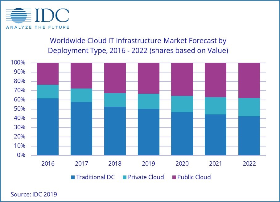 Selon l’IDC Worldwide Quarterly Cloud IT Infrastructure Tracker, le chiffre d'affaires des fournisseurs de produits pour infrastructures informatiques en cloud (serveur, stockage et produits d’interconnexion Ethernet), public et privé compris, a augmenté de 47,2% sur un an au troisième trimestre de 2018, pour atteindre 16,8 milliards $.