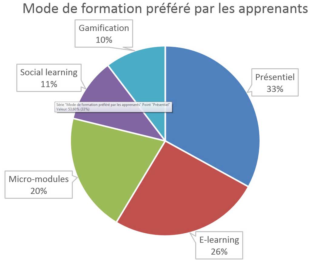 Deux visions s’opposent en ce qui concerne la préférence perçue des modes de formation préférés par les collaborateurs. Une majorité (53,6%) estime que les collaborateurs préfèrent la formation en présentiel, ce qui peut s’expliquer par un accompagnement à la formation en ligne insuffisant ou inadapté. Le e-learning suit peu après (41,6%). Parmi les modalités de formation en ligne, les micromodules en ligne sont vus comme les plus pertinents (32,8%), puis le social learning (17,6%) et la gamification (16,8%).
