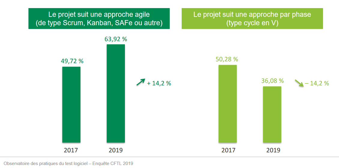 Cette intégration s’explique notamment par la croissance significative des projets en approche Agile (+14,2 % par rapport à 2017) avec entre autres l'arrivée de l'ATDD (Acceptance Test Driven Development pour projets Agiles)/BDD pour 17 % des testeurs !