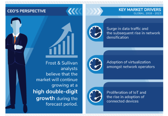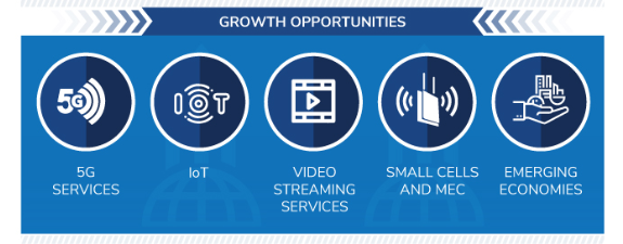Parmi les grandes tendances qui devraient avoir une influence positive sur le marché au cours des trois à cinq prochaines années, on peut citer l'essor du trafic de données et l'augmentation subséquente de la densification des réseaux, la prolifération de l'IoT et l'adoption massive des appareils connectés, l'adoption de la virtualisation par les opérateurs de réseaux et le lancement prévu des services 5G.