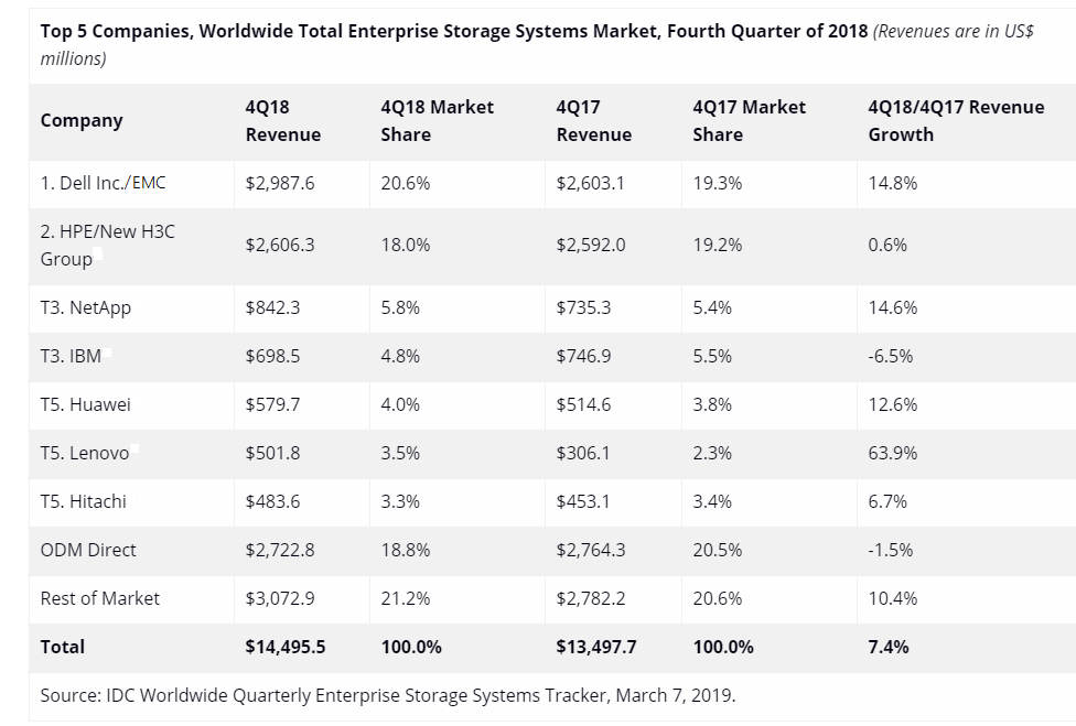 D’après l’indice IDC Worldwide Quarterly Enterprise Storage Systems Tracker, les revenus des fournisseurs sur le marché mondial des systèmes de stockage d’entreprise ont augmenté de 7,4 % d’un exercice à l’autre pour atteindre 14,5 Md$ au quatrième trimestre de 2018. Les expéditions totales ont augmenté de 1,7 % d’un exercice à l’autre pour atteindre 92,5 exaoctets au cours du trimestre.