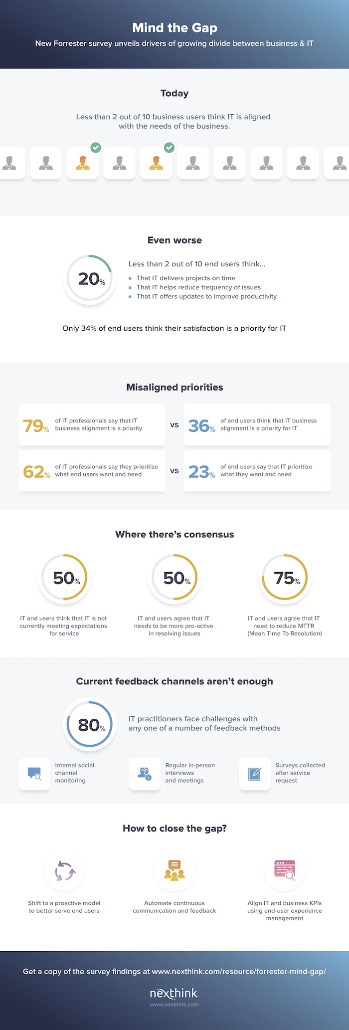 L’étude Forrester, dont nous publions le résumé dans l’infographie ci-dessous, se termine en proposant quelques axes de réflexions pour réduire le fossé, comme d’adopter des modèles proactifs, de mettre en place des méthodes de feedback et de les automatiser avec une communication en continu, ou encore d’aligner les KPI sur la gestion et l’expérience des utilisateurs finaux.