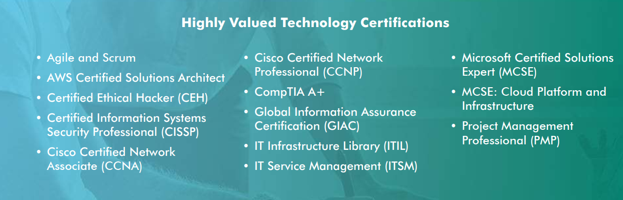 Afin d’évoluer plus rapidement, il est recommandé de disposer de certifications parmi celles qui sont les plus demandées :