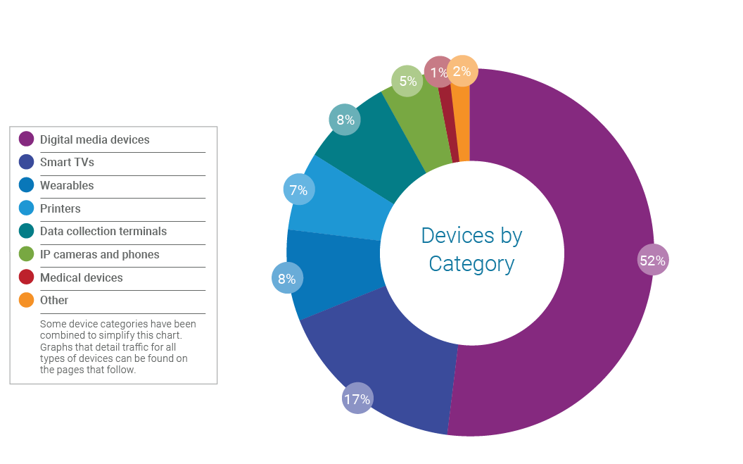 Les dispositifs IoT vus le plus souvent dans le nuage étaient des décodeurs vidéo, suivis des téléviseurs connectés, des montres intelligentes, des lecteurs multimédia et des imprimantes. Le tableau suivant montre la répartition des dispositifs IoT dans les différentes catégories.