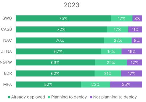 Le graphique ci-dessous montre l’état d’avancement du déploiement des solutions, en premier lieu figurent les passerelles web sécurisée (SWG).
