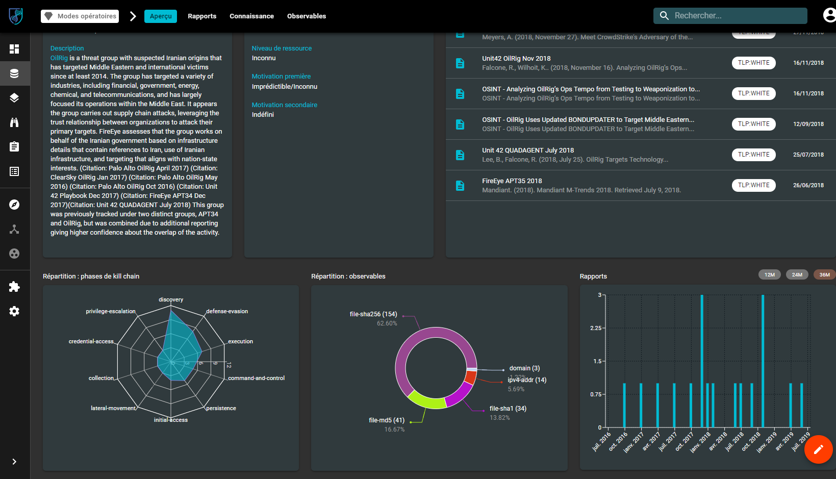 L’objectif est de créer un outil complet permettant aux utilisateurs de rassembler l’information technique (comme les PTT et les données observables) et non technique (comme l’attribution suggérée, la victimologie, etc.) tout en reliant chaque information à sa source primaire (un rapport, un événement du DMU, etc.), avec des caractéristiques comme des liens entre chaque information, les dates de première et dernière consultation, les niveaux de confiance, etc. L’outil est capable d’utiliser le framework MITRE ATT&CK (via un connecteur dédié) pour structurer les données. L’utilisateur peut également choisir d’implémenter ses propres ensembles de données.