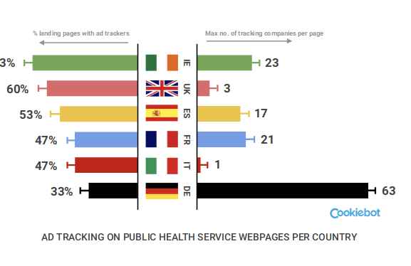 Cookiebot a également examiné les sites des services de santé publique. Résultat, la moitié cachent des trackers commerciaux.