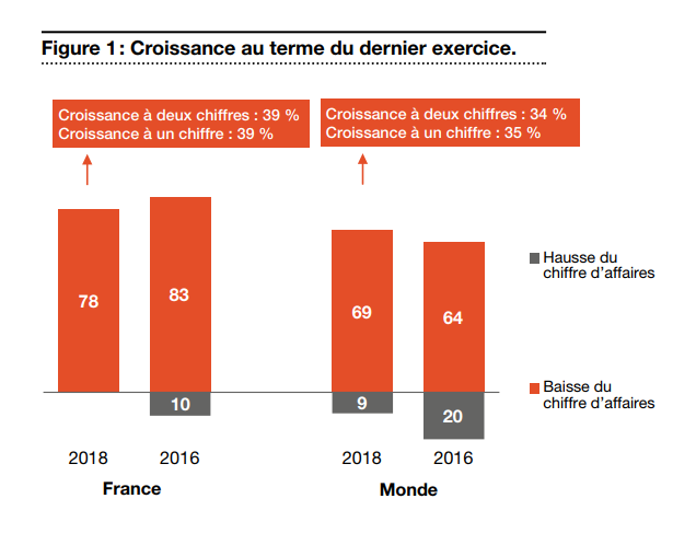 Premièrement, leur croissance reste supérieure à la moyenne globale. 78 % affichent une hausse de leurs revenus (39 % constatent une croissance à deux chiffres).