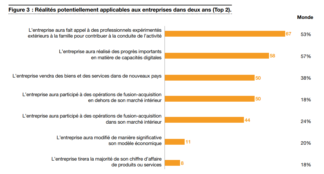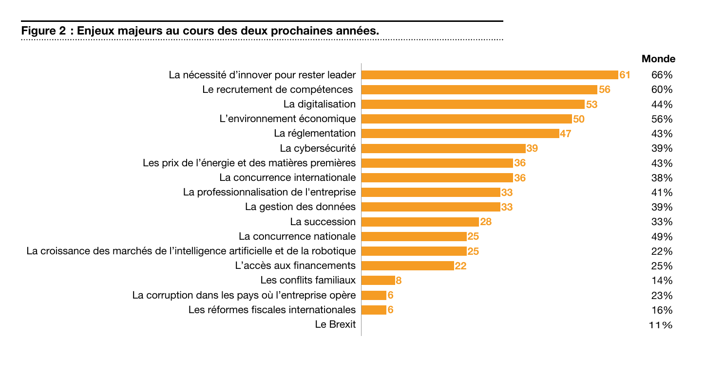 Cette étude fournit, depuis 16 ans, un panorama de la santé des entreprises familiales dans le monde. En 2018, PWC a mené cette étude auprès de 3 000 entreprises dans 50 pays. Pour le focus France, 36 dirigeants ont répondu à un questionnaire et 6 d’entre eux ont accordé un entretien exclusif.