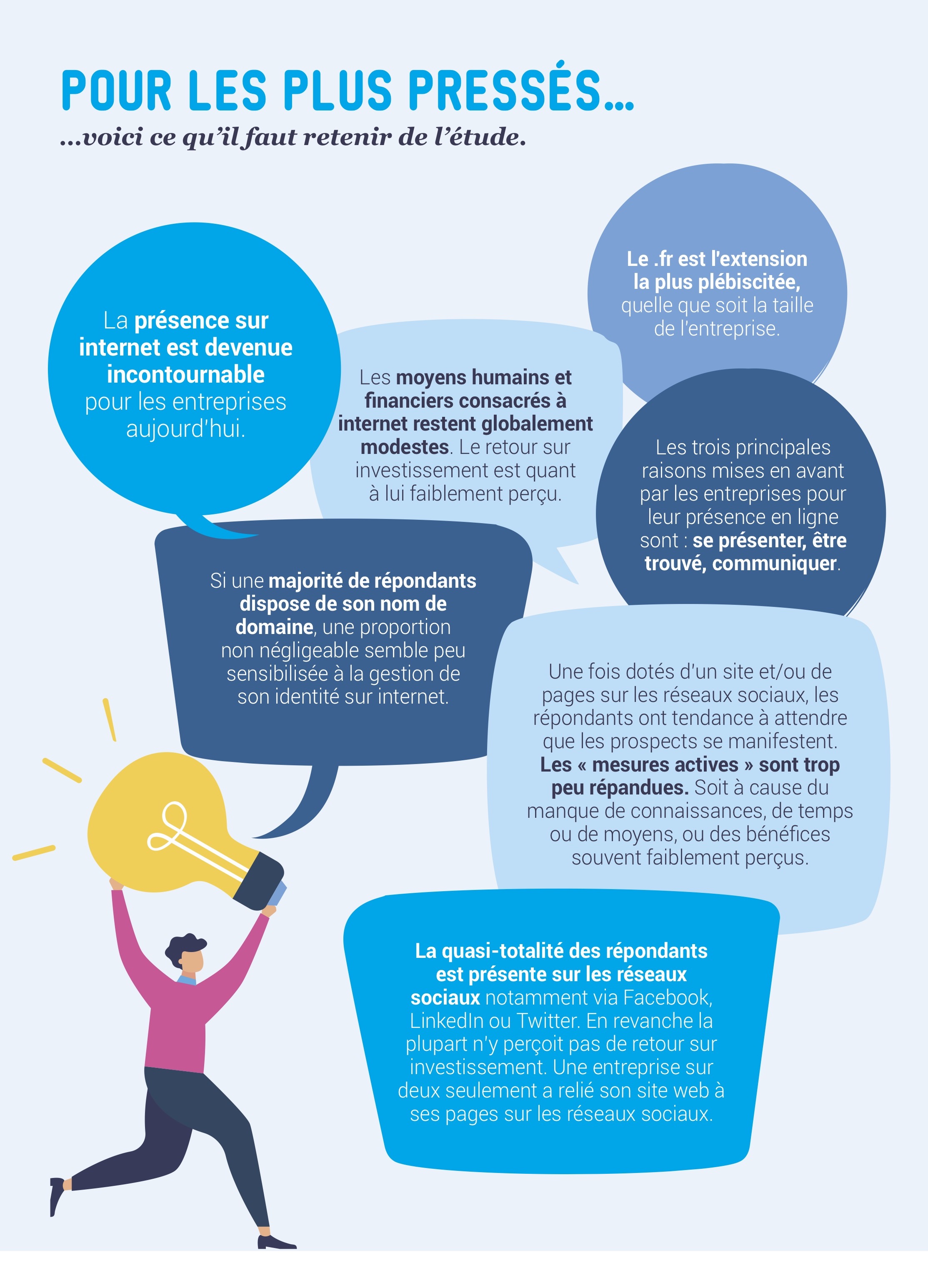 La présence sur Internet est devenue incontournable pour les entreprises aujourd’hui. Mais, selon une étude Deloitte, 11% seulement des PME françaises utilisent des outils numériques au quotidien. C’est pourquoi l’Afnic s’est engagée à accompagner les entreprises dans le développement de leur présence en ligne. Via son site Réussir avec le Web (https://www.reussiravecleweb.fr), elle a lancé une étude à destination des microentreprises, de TPE et de PME, afin d’évaluer leur maturité sur internet et leur appropriation des différentes dimensions de la présence en ligne.
