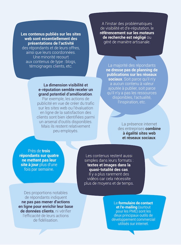 À noter que pour les PME, la possibilité de communiquer avec ses clients et prospects arrive en 2ème position avec 55%. Quant à la possibilité de vendre en ligne, elle est très dépendante de l’activité de l’entreprise.