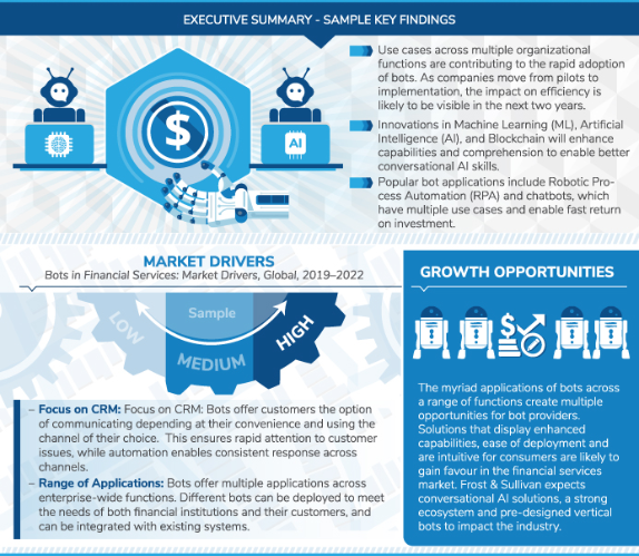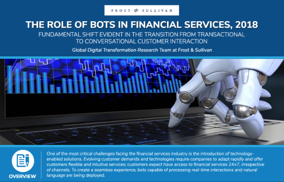 Selon Frost & Sullivan, les sociétés de services financiers visent l'excellence opérationnelle avec une approche Bot en tant que différentiateur. Cela créé des opportunités de croissance grâce aux chatbots et l'automatisation robotique des processus.