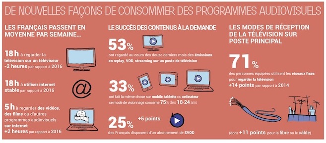 Plus de la moitié (55%) des Français se connectent à domicile sur un réseau mobile. Ils passent désormais autant de temps sur Internet, 18 heures par semaine, qu’à regarder la télévision sur un téléviseur. Le baromètre atteste également du succès des contenus à la demande, émissions en replay, VOD ou streaming, sur un écran TV.