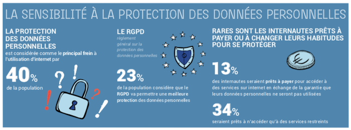 Pour 40% des Français, la protection des données personnelles est le principal frein à l’utilisation d’internet. Les Français montrent leur sensibilité pour la protection de leurs données, ils sont à ce titre 23% à voir le RGPD positivement. Par contre 13% seulement se disent prêts à payer pour accéder à des services garantissant la sécurité de leurs données !