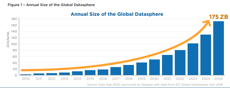 Résultat, le volume de données ne cesse d’exploser. Selon le cabinet IDC, la production de data passerait de 33 zettaoctets en 2018 à 175 zettaoctets (175 milliards de téraoctets) en 2025.
