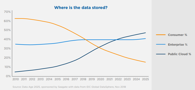 L’un des principaux moteurs de la croissance étant le cloud, IDC prévoit que les octets installés dans le Cloud public augmenteront pour passer de 4 % en 2015 à 42 % en 2025.