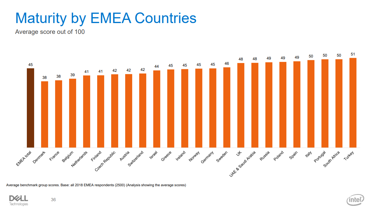 Hormis les causes les plus communément citées pour justifier ce retard (manque de budgets, craintes quant à la sécurité…), l’une des conclusions de l’étude a de quoi laisser perplexe : une partie de ce retard serait due à des causes… psychologiques. Car en effet, les marchés émergents (53%) estiment que la transformation numérique est une chance de rattraper leur retard et venir perturber les rapports de force, contre seulement 40% dans les pays développés.
