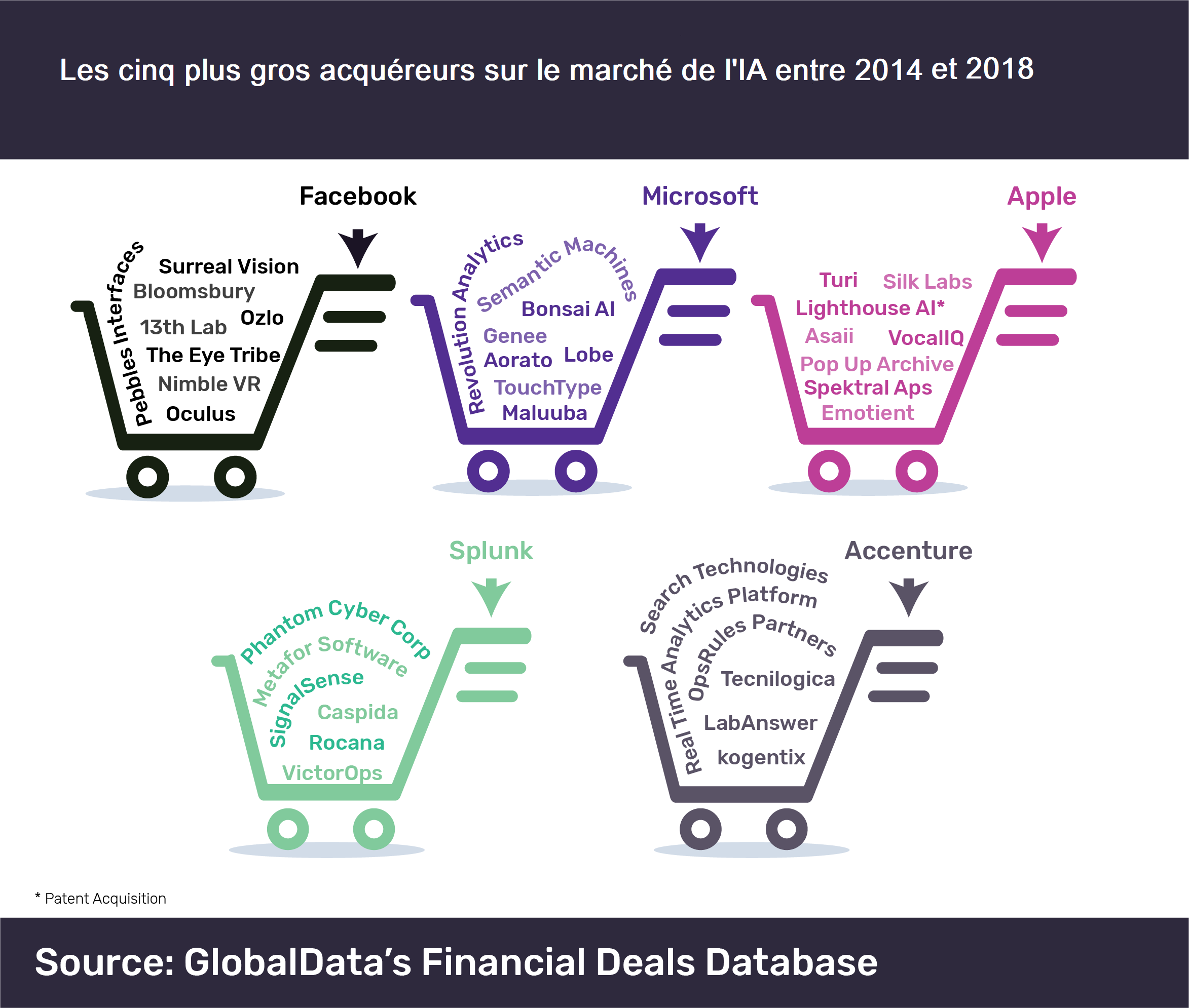 Les quatre sociétés américaines, Facebook, Microsoft, Apple et Splunk, ont collectivement réalisé 30 acquisitions dans le domaine de l’intelligence artificielle entre 2014 et 2018, tandis qu’Accenture a acquis six sociétés dans ce domaine au cours de la même période.