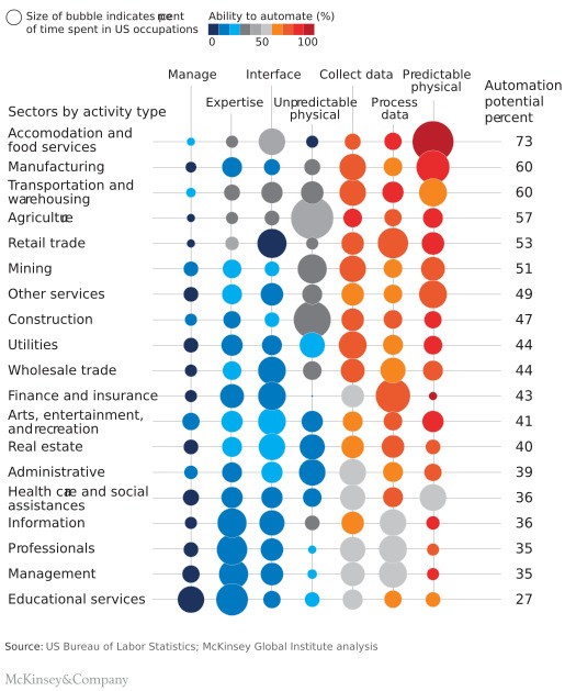 Le McKinsey Global Institute a réalisé une étude complète du potentiel d'automatisation dans un large éventail d'industries. Les cinq principales industries en termes de potentiel d'automatisation sont l'hôtellerie, la fabrication, la logistique, l'agriculture et la vente au détail. La moyenne pour l'ensemble des industries est de 53%. En d'autres termes, un travail sur deux pourrait bientôt être effectué par une machine.