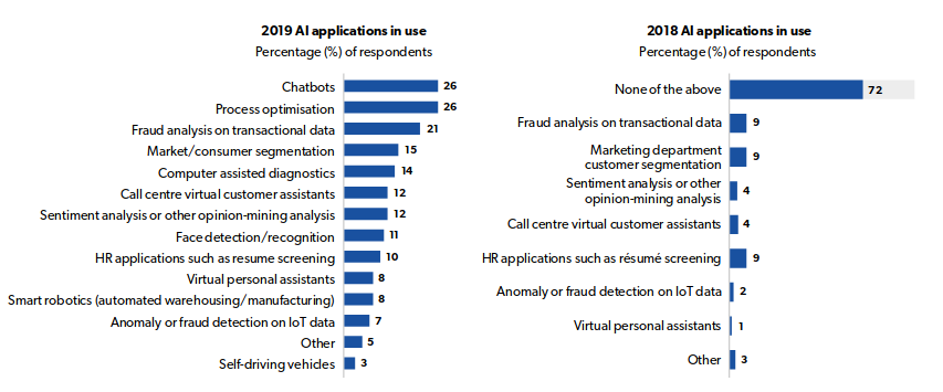 L’évolution des usages de l’IA entre 2018 et cette année (graphique ci-dessus) montre que les entreprises cherchent en priorité à optimiser l’expérience client en déployant en particulier des chatbots et des assistants virtuels dans les call centers.