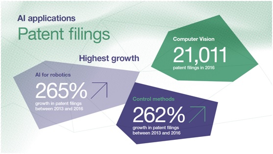 • L'intelligence artificielle pour la robotique est passée de 622 demandes de brevet en 2013 à 2 272 en 2016, soit une augmentation globale de 265 % ou une croissance annuelle moyenne de 55 %.