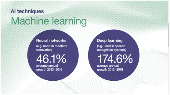 • Le Deep Learning est la technique d'intelligence artificielle qui connaît la croissance la plus rapide, avec près de 20 fois plus de demandes de brevets, passant de 118 en 2013 à 2 399 en 2016, soit une croissance annuelle moyenne de 175 %.