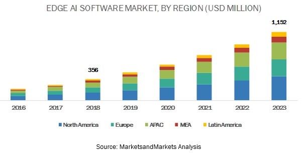 MarketsandMarkets prévoit que la taille du marché mondial des logiciels d'IA déportée passera de 356 millions de $ en 2018 à 1 152 millions de $ en 2023, soit un TCAC de 26,5%. Les applications et les objets dépendant de l’IA se multipliant, les facteurs de croissance du marché sont nombreux. Et bien que les préoccupations en matière de confidentialité et de sécurité liées aux solutions d'intelligence artificielle déportée puissent freiner la croissance du marché, celui-ci devrait tout de même fortement progresser.