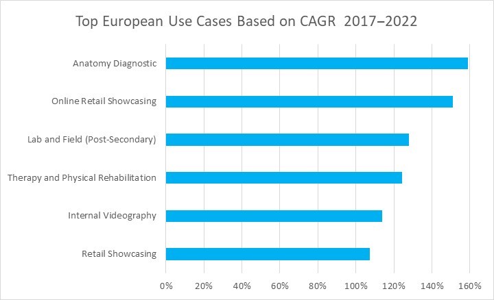 Le segment consumer (les jeux vidéo, le visionnage de vidéos …) sera la principale source de dépenses en AR/VR en Europe au cours de la période de prévision de cinq ans, bien que sa part du marché total passera des deux tiers en 2017 à un tiers en 2022.